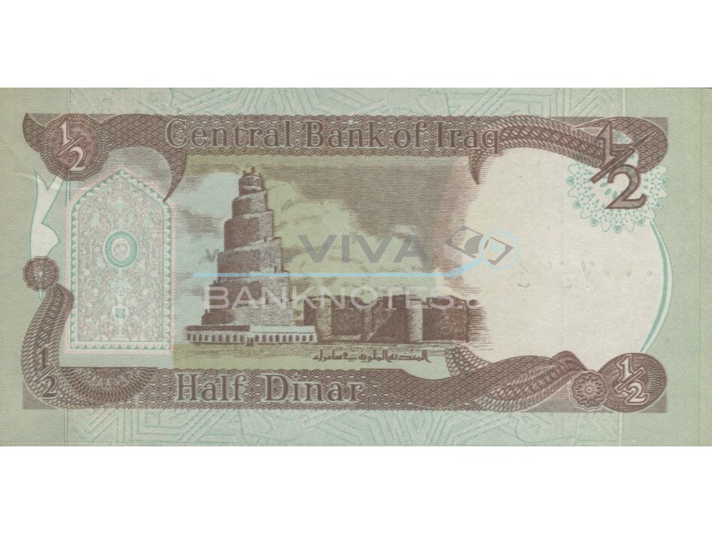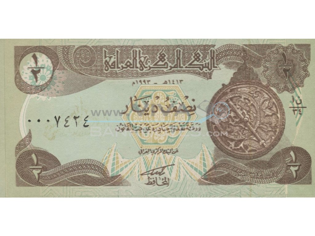1/2 Dinar 1993 UNC. Brown on multicolor underprint. Astrolabe at right. Gulf War Emergency Issue. Back: Minaret of Samarra. Light green underprint over watermark area. Issued by Central Bank of Iraq Printer: Chinese.