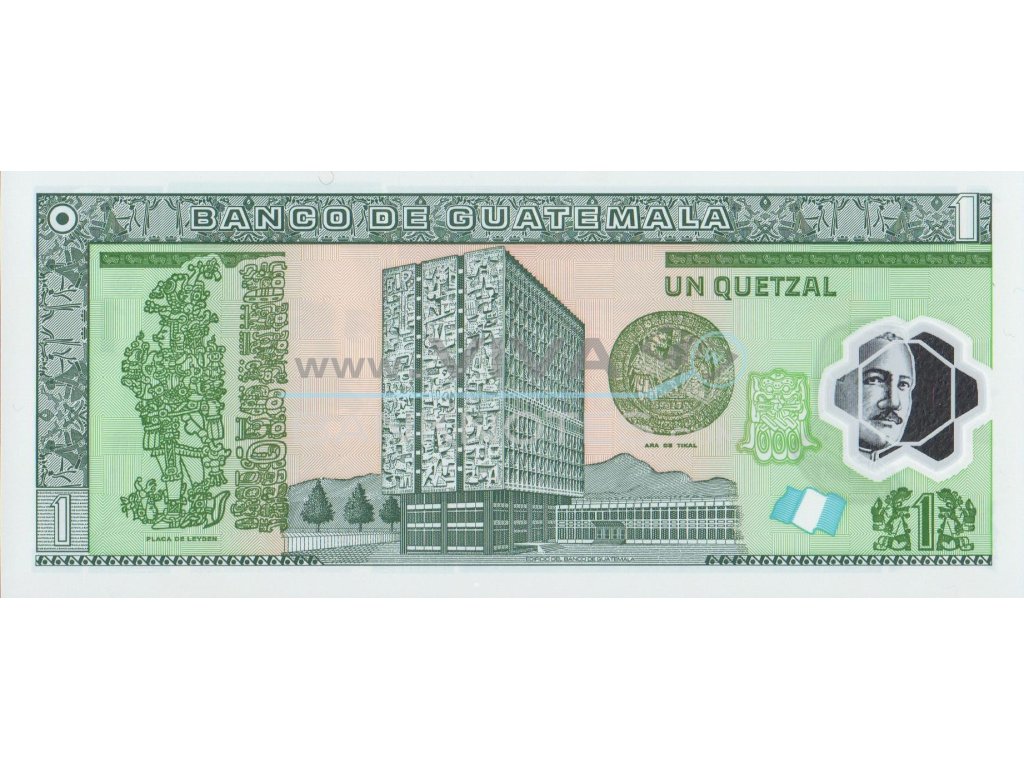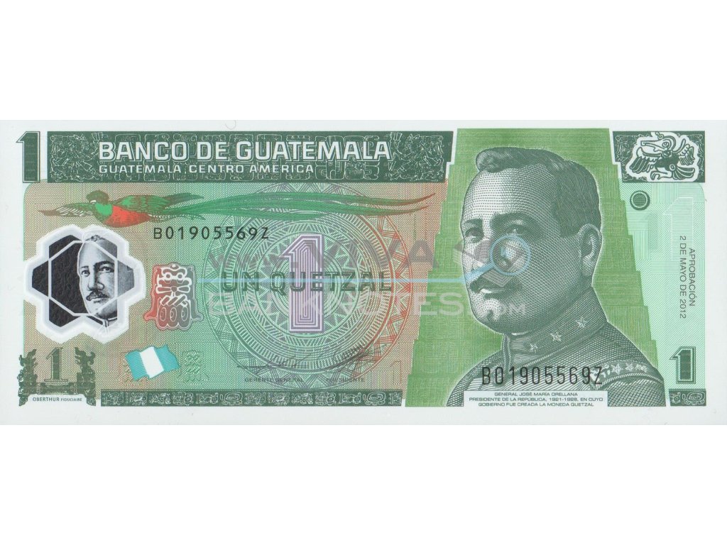 1 Quetzal 2.5.2012 UNC. Green, orange, red. Front: Spanish text; flying quetzal bird; flag as registration device; Mayan glyph as registration device; stylized temple with glyphs; president and general, José María Orellana; Mayan bird. Back: Spanish text; standing Mayan man and glyphs from jade Leyden plate (placa de Leyden); trees and Bank of Guatemala headquarters building in Guatemala City (Edificio del Banco de Guatemala); circular Mayan carving (ara de Tikal); Mayan glyph; flag. Portrait of Orellana in transparent window. Printer: Oberthur Fiduciaire, France. Issuiing Authority: Banco de Guatemala. Signature: Francisco/Barquín.156x67mm