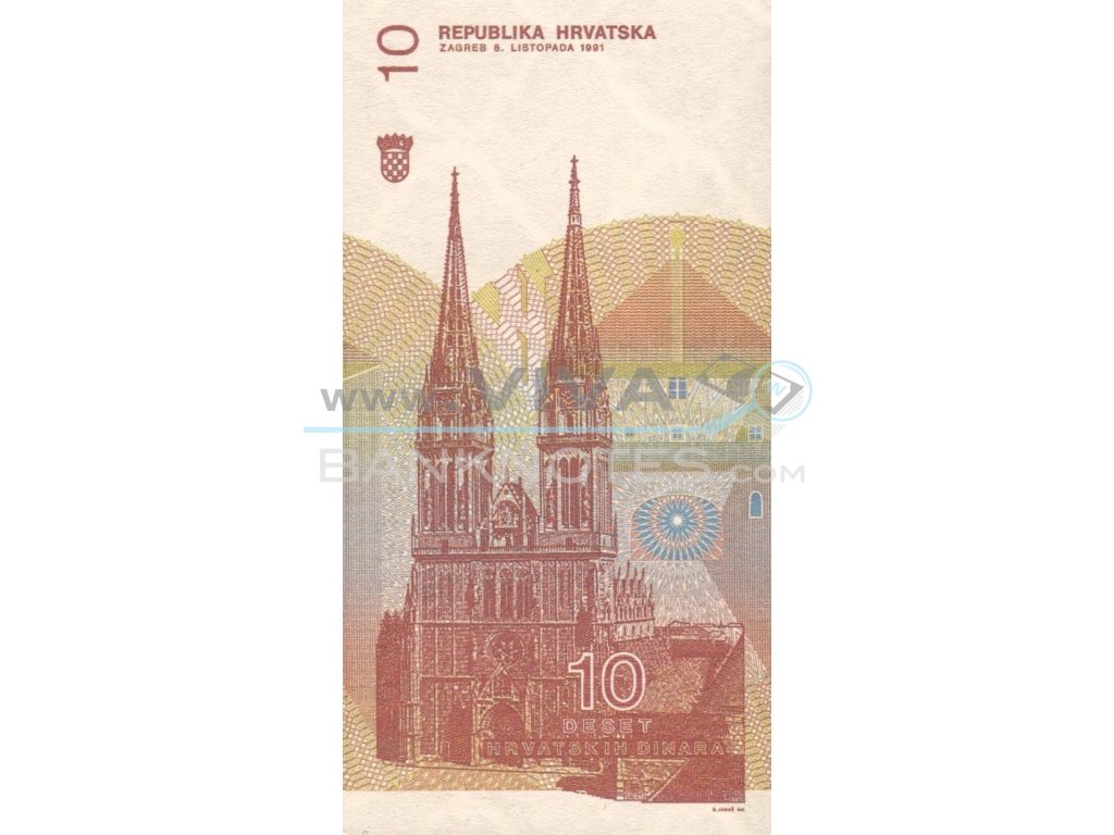 10 Hrvatskih Dinara 8.10.1991 UNC. Pale red-brown on multicolor underprint. Ruder Boskovic at center, geometric calculations at upper right. 4,5mm serial number. Back: Vertical back with Zagreb cathedral and artistic rendition of city buildings behind. watermark: Lozenges. Printer: Swedish. UV: fibers fluoresce yellow. 105x55mm