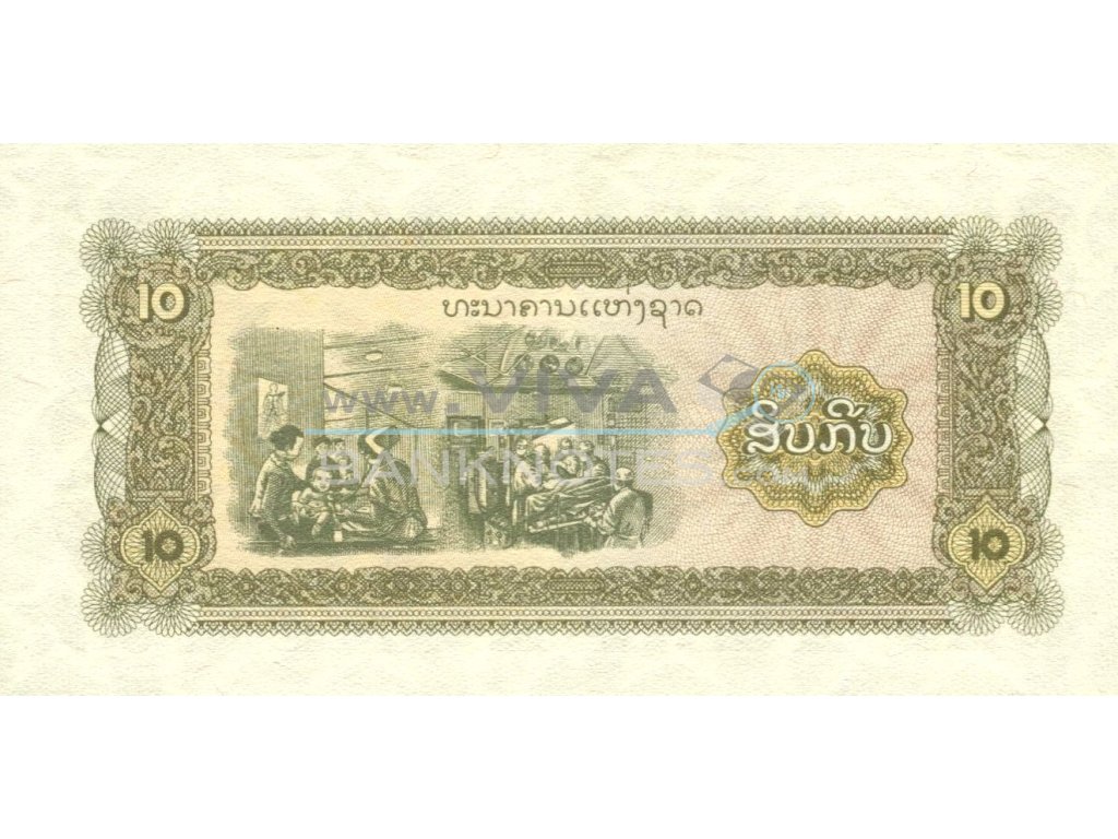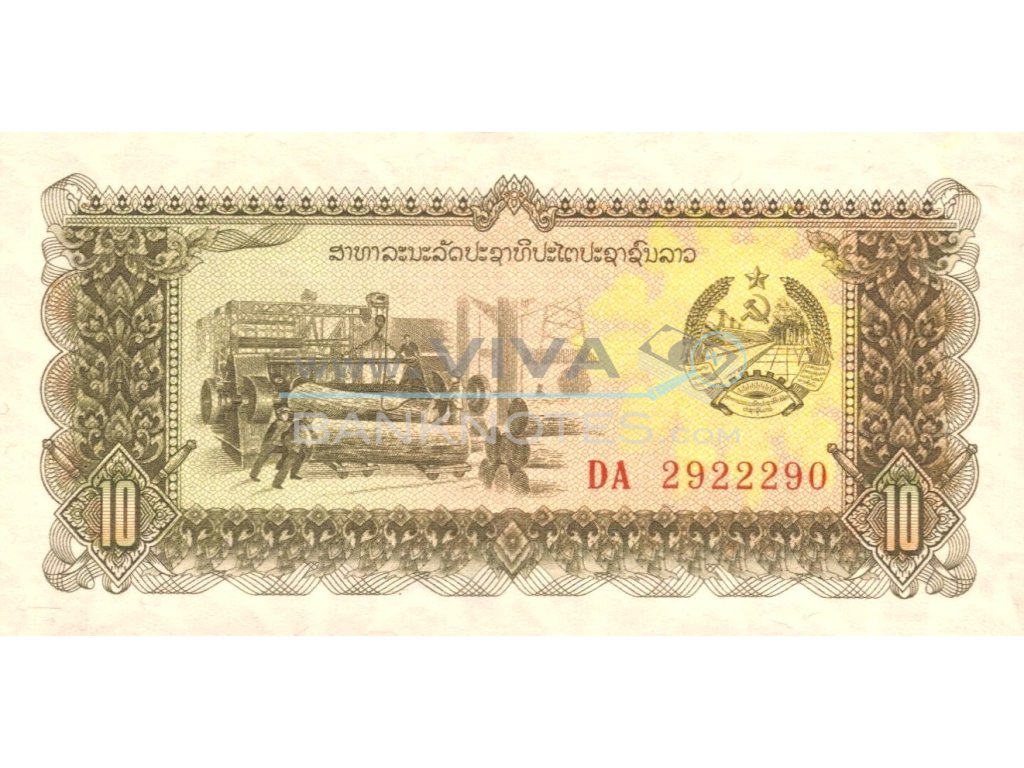 10 Kip 1979 UNC. Dark brown on multicolor underprint. Lumber mill at left, arms at upper right. Back: Medical scenes at left. Watermark: Stars, hammer and sickles. Correct spelling of denomination and currency on back (without white dots within the diacritical marks - reads "Kip"). Issued by Bank of the Lao Peoples Democratic Republic. 113x57mm