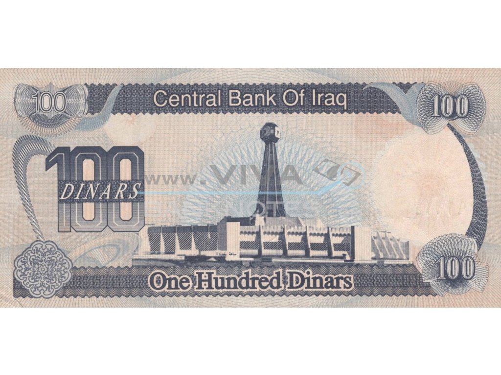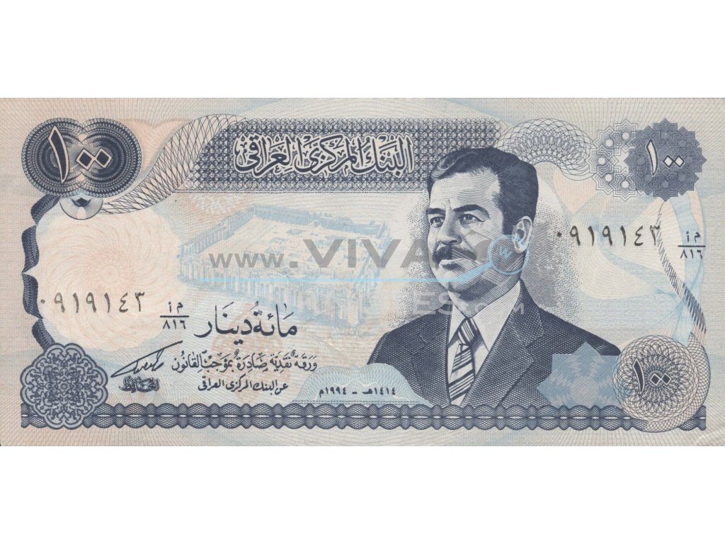 100 Dinars 1994 AU. Dark blue on light blue and pale ochre underprint. Al-Ukhether castle at center. Saddam Hussein at right. Back: Baghdad clock at center. Watermark: Printed Falcon's head. First diacritical mark in the text of the denomination is above the first letter (from the right). Signature: Tariq al-Tukmachi. Printed on white paper which fluoresces. Issued by Central Bank of Iraq. 178 x 86 mm