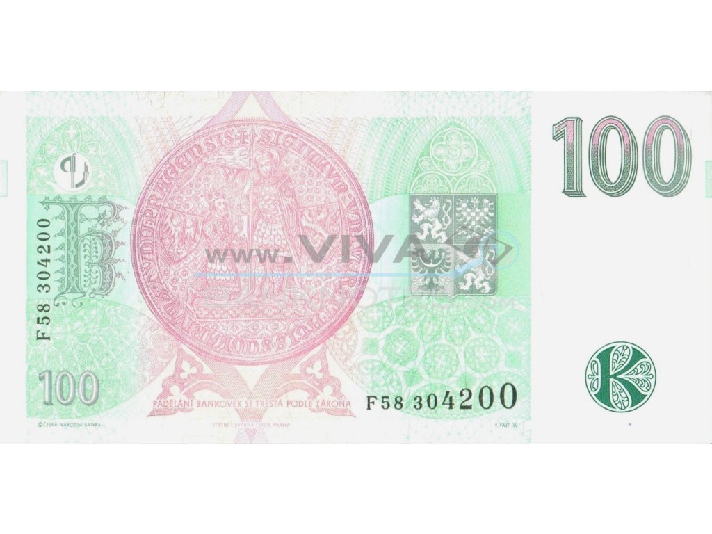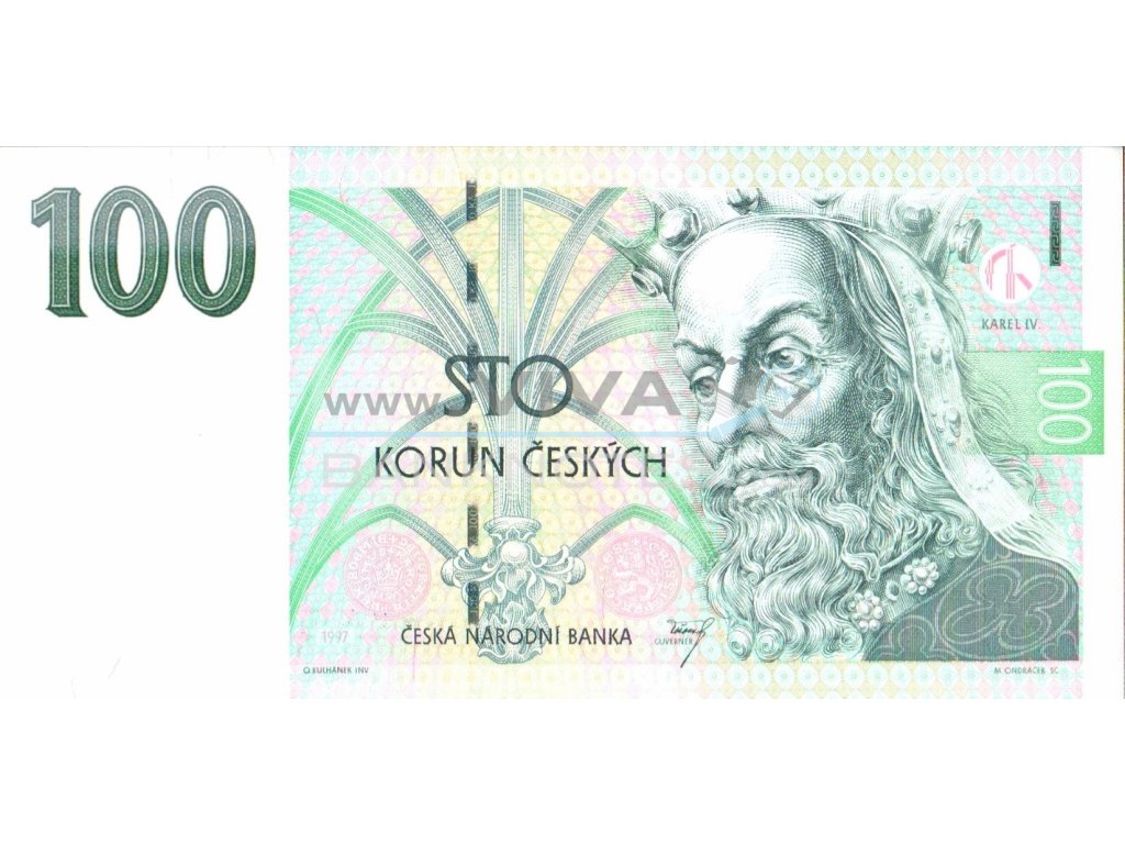 100 Korun 1997 UNC. Dark green,dark olive-green and black on multicolor underprint. King Karel IV at right.Back: Large seal of Charles University at left center with stylized K in circle at lower right. Serial number prefix C,D,E,F,G,H. Watermark: King Karel IV. Prinnter. STC-P. Windov stripe narrow foil segments, microtext 100Kč, fibers in paper. Artists: Kulhánek, engraving Ondráček, Fajt, signature Tošovský. 140x69mm.