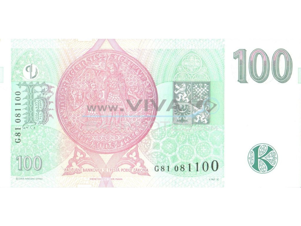 100 Korun 1997 UNC. Dark green,dark olive-green and black on multicolor underprint. King Karel IV at right.Back: Large seal of Charles University at left center with stylized K in circle at lower right. Serial number prefix C,D,E,F,G,H. Watermark: King Karel IV. Prinnter. STC-P. Windov stripe narrow foil segments, microtext 100Kč, fibers in paper. Artists: Kulhánek, engraving Ondráček, Fajt, signature Tošovský. 140x69mm.