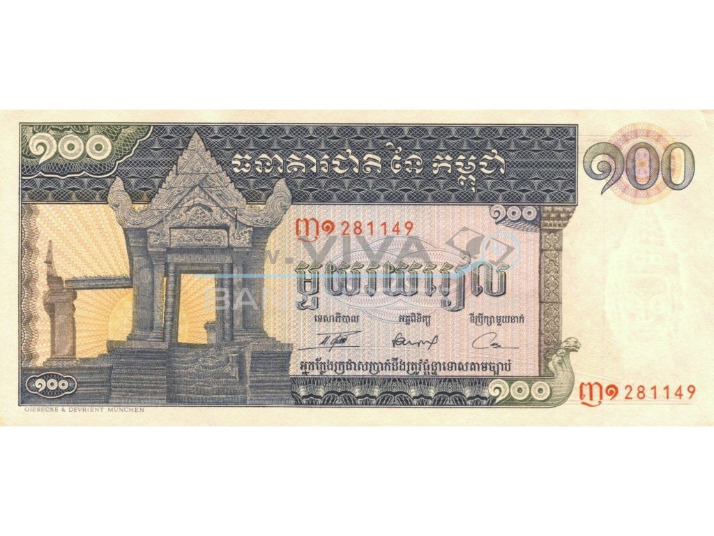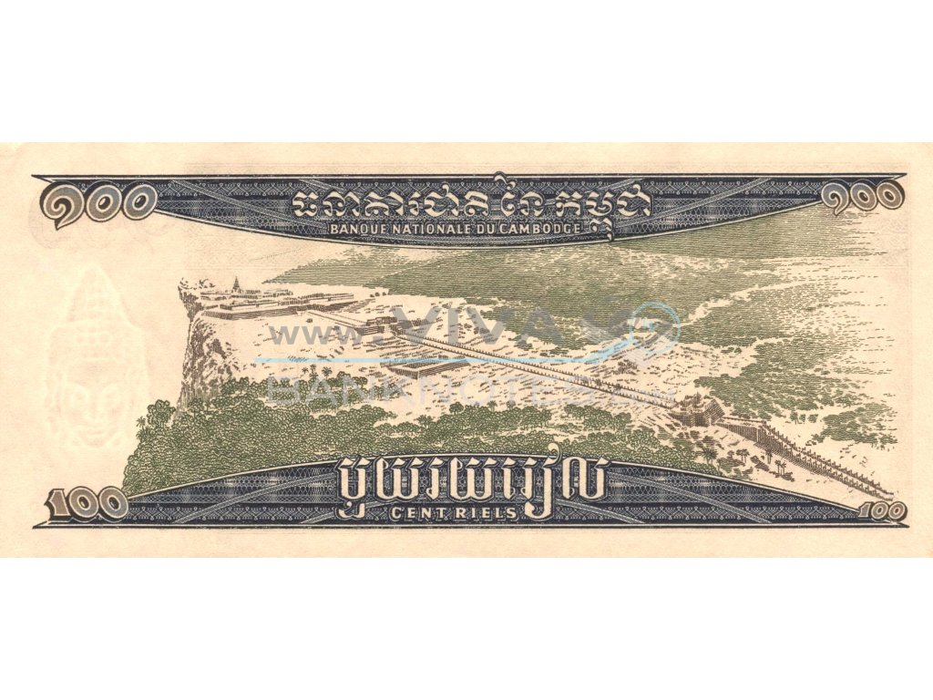100 Riels (1963 - 1972) UNC. Blue-black, dark green and dark brown on multicolor underprint. Sun rising behind Temple of Preah Vihear at left.Back: Blue, green and brown. Aerial view of the Temple of Preah Vihear. Watermark: Buddha. Printer: G&D. 174x77mm.Signature 13. Not issued.