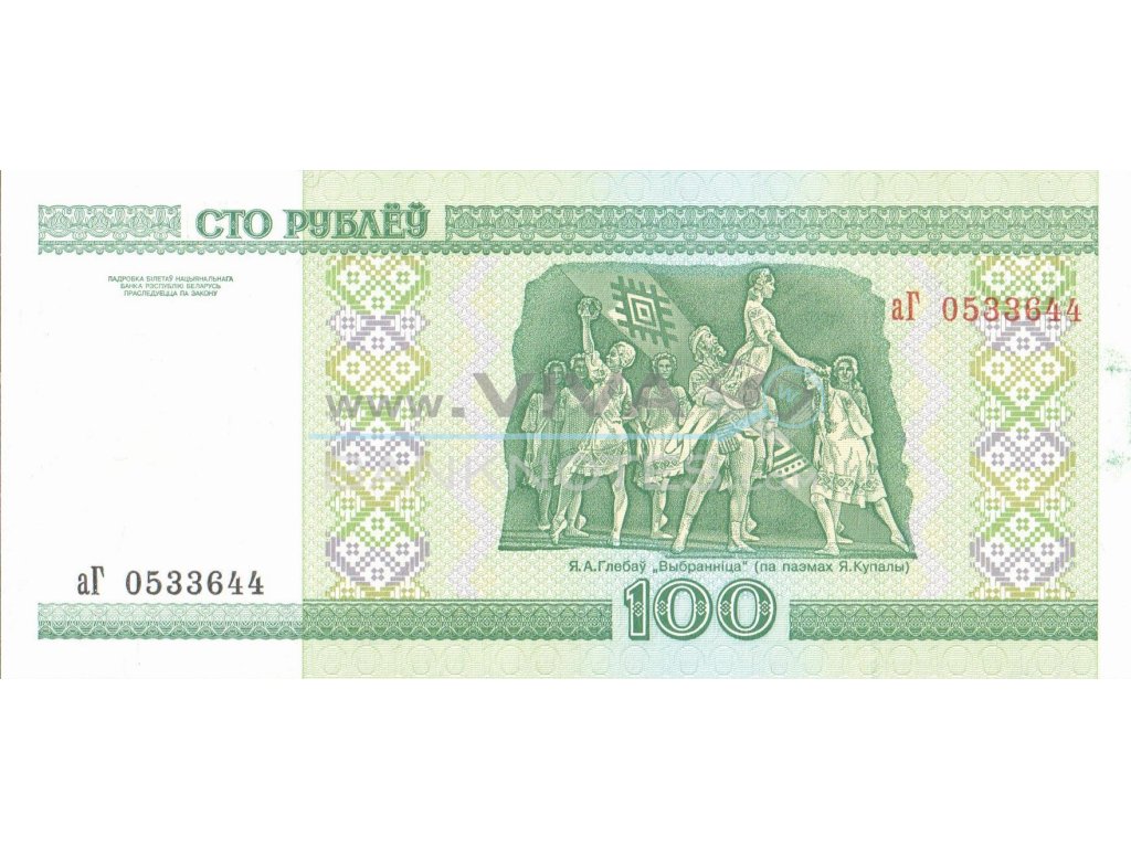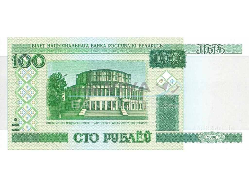 100 Rublei 2000 UNC; 2011. Green on multicolor underprint. Bolshoi Opera and Ballet Theater at center, tapestry at left. Back: Scene from ballet Vibrannitsa Watermark: ballerina UV: fluoresce red, blue. Security thread yellow, value yellow; back: upper serial # red. 150x69mm.
