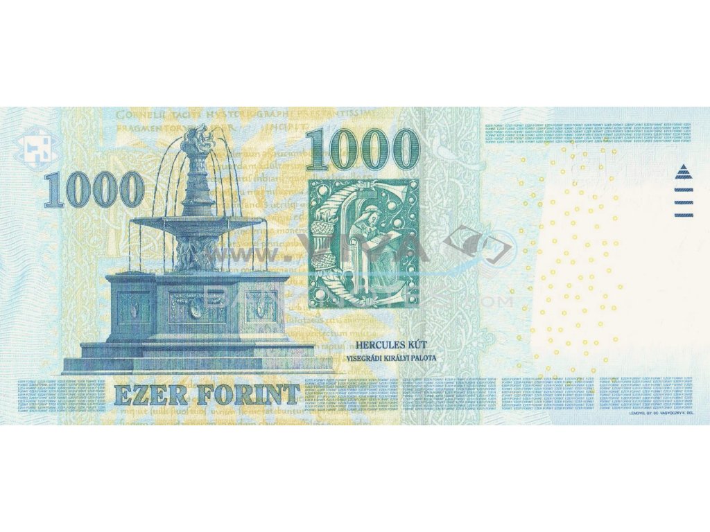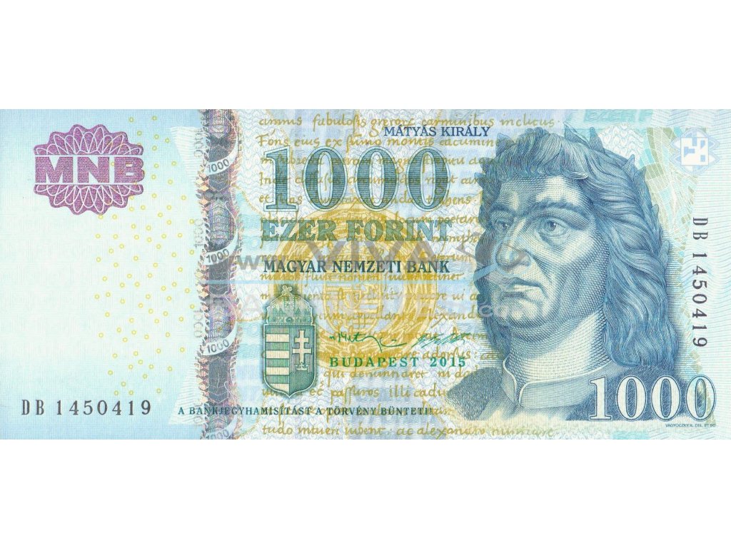 1000 Forint 2015 197e Series DB UNC. Blue, light yellow brown on multicolor underprint. King Mátyás at right. Serial # black. Back: Hercules fountain. Drop cap letter "C" with person reading. Omron rings added. Issued by Magyar Nemzeti Bank. 154x70mm