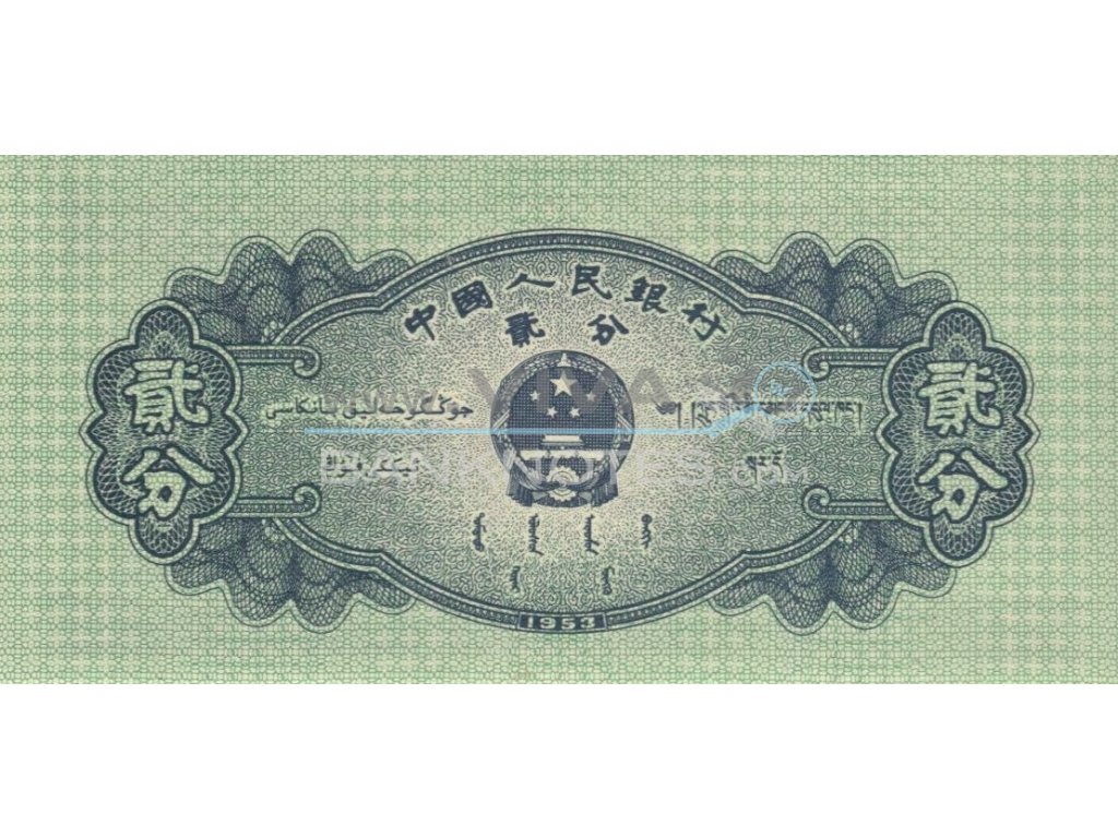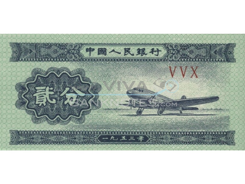 2 Fen 1953 UNC. Dark blue on light blue underprint. Airplane at right. Back: Arms at center. Roman control numerals only
