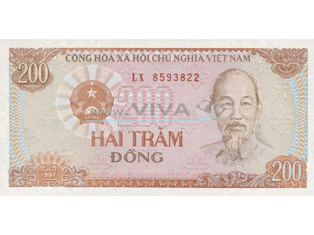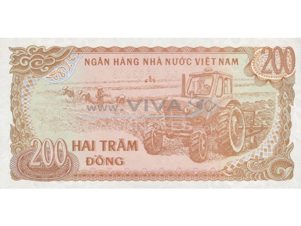 200 Đồng 1987 UNC. Brown and beige on a multi-colored background. Ho Chi Minh on the right, coat of arms of Vietnam Socialist Republic on the left center. Reverse: workers in the rice field in the middle of a tractor. Issued by: Ngân Hàng Nhà Nu'ớc Việt Nam (State Bank of Vietnam). Serial number types sherif wide. UV: fibers fluoresce red and blue, serial numbers red. 131x62mm