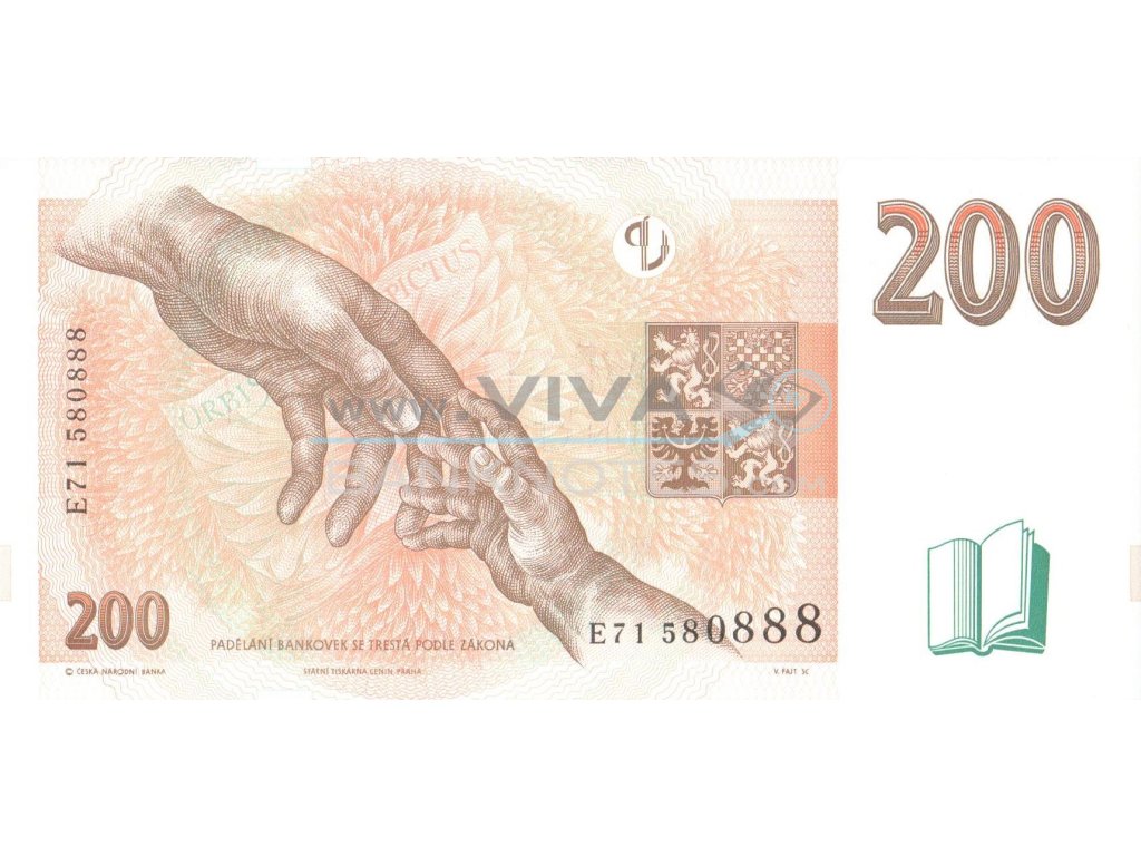 200 Korun 1998 UNC. Deep brown on pale orange and light green underprint. Jan Amos Komensky at right, arms at center right. Stylized open book at lower right. Back: hands outreached at left center, stylized open book at lower right. Serial number prefix C,D,E,F,G. Watermark: Jan Amos Komensky. Printer: STC-P. Windou stripe narrow foil segments, microtext 200 Kč, fibers in paper; Artists: Kulhánek, engraving Ondráček, Fajt, signature Kysilka. 146x69mm