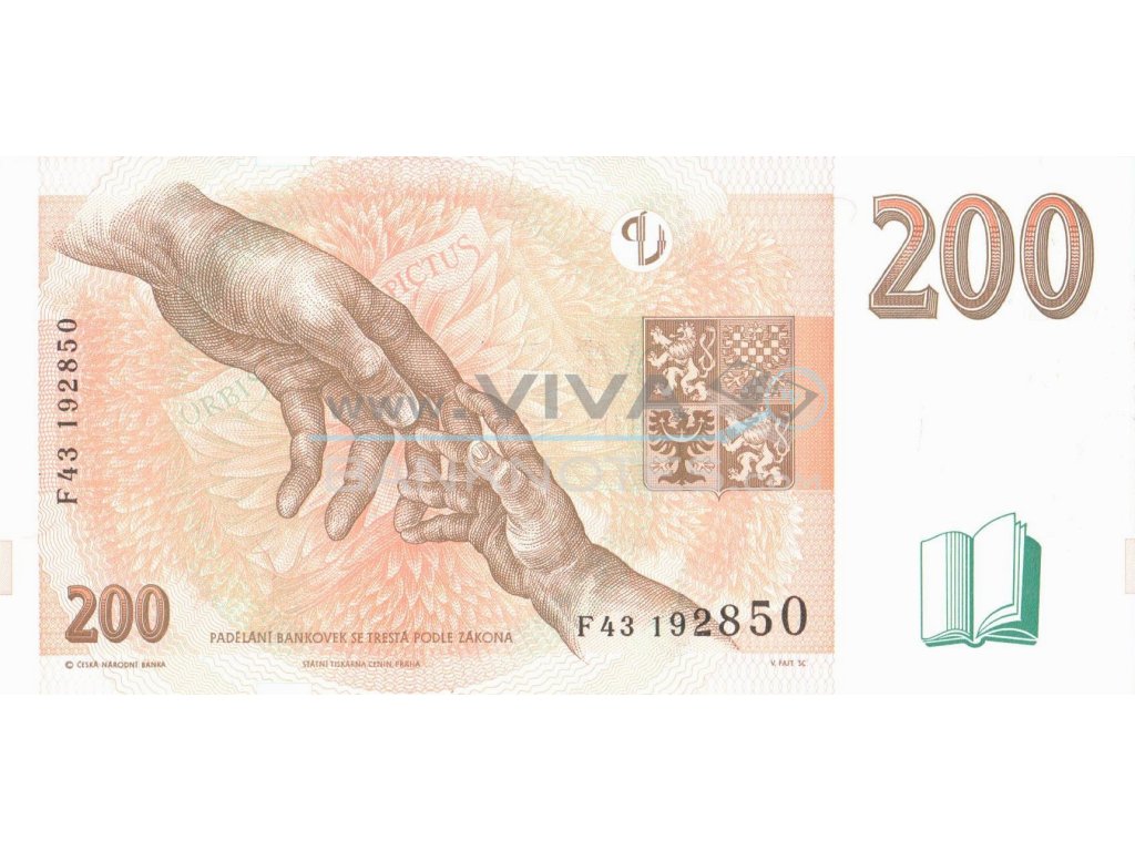 200 Korun 1998 UNC. Deep brown on pale orange and light green underprint. Jan Amos Komensky at right, arms at center right. Stylized open book at lower right. Back: hands outreached at left center, stylized open book at lower right. Serial number prefix C,D,E,F,G. Watermark: Jan Amos Komensky. Printer: STC-P. Windou stripe narrow foil segments, microtext 200 Kč, fibers in paper; Artists: Kulhánek, engraving Ondráček, Fajt, signature Kysilka. 146x69mm