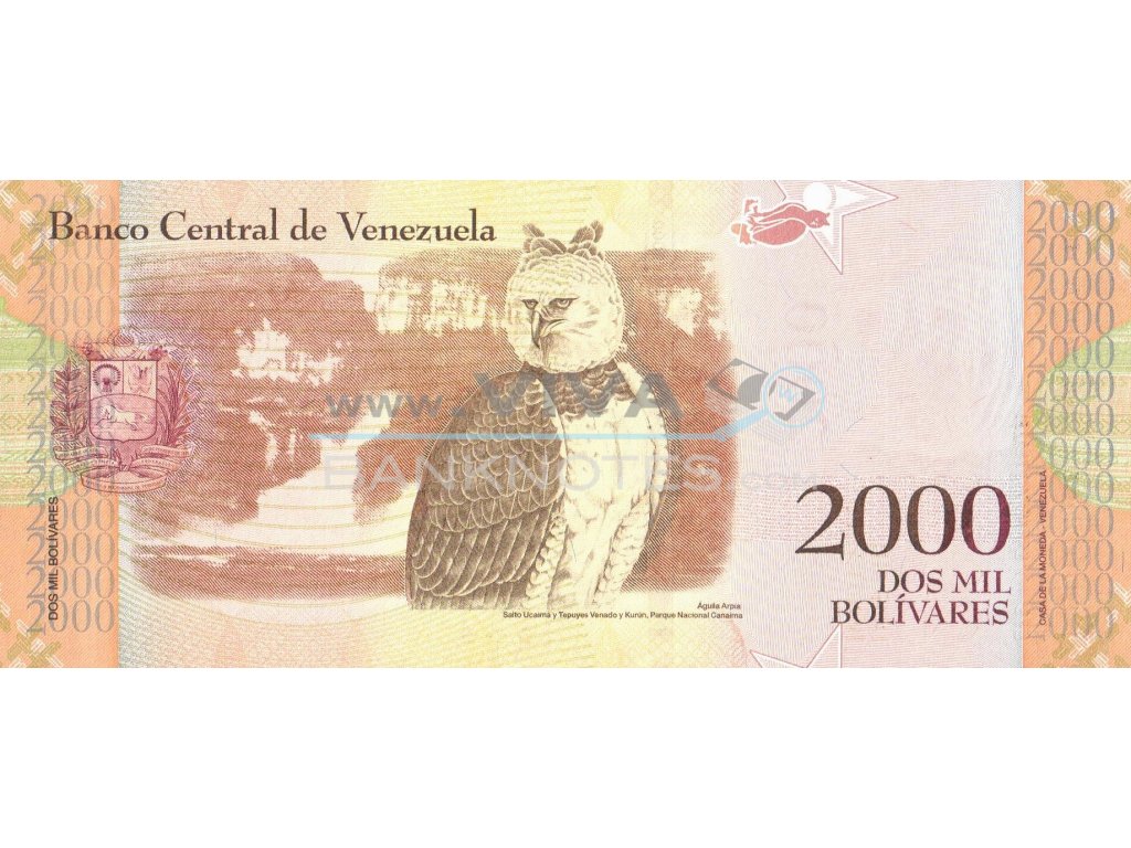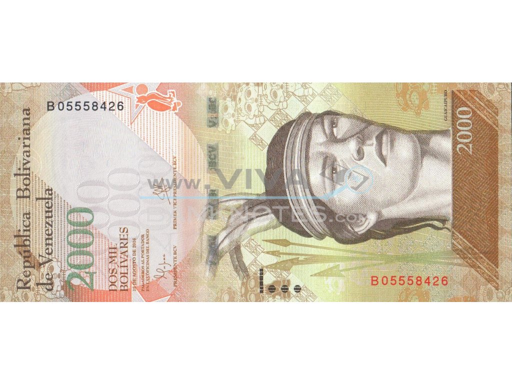 18.8.2016 Brown and orange. Cacique Gualcalpuro. Back: Harpyeagle. Signature Nelson José Merentes Diaz and José Khan. Issued by Banco Central de Venezuela. Prefix B. 156x69mm