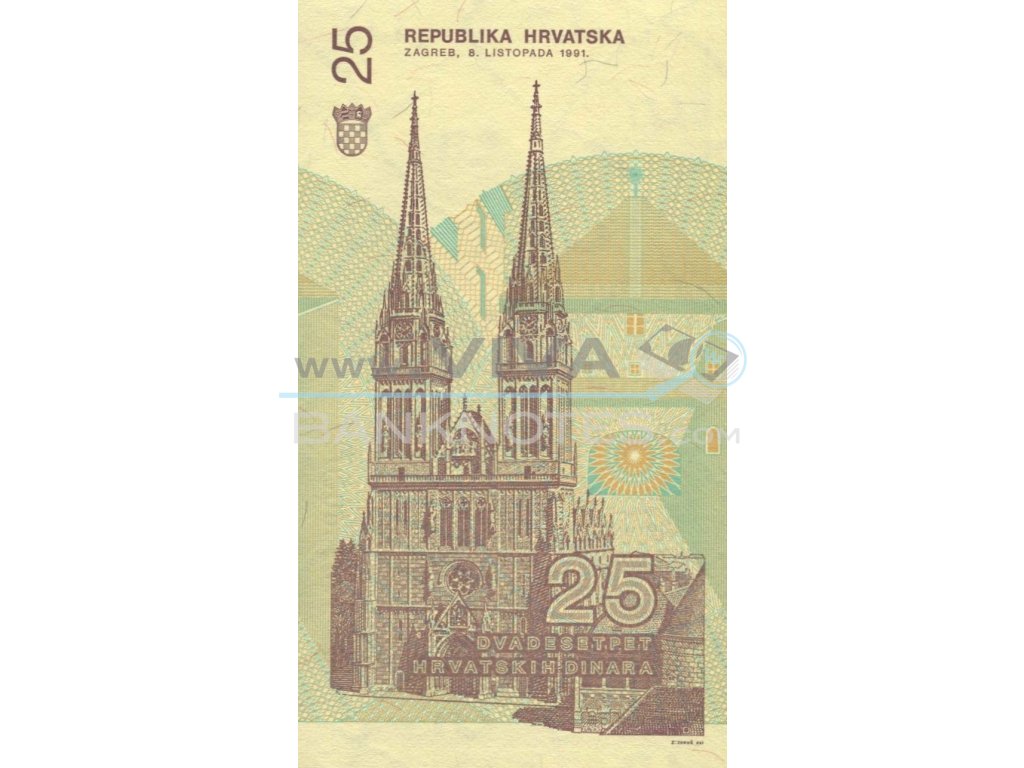 25 Dinara 8.10.1991 UNC. Dull purple on multicolor underprint. Ruder Boskovic at center, geometric calculations at upper right. Buff paper with 2.8mm serial number. Back: Vertical back with Zagreb cathedral and artistic rendition of city buildings behind. Watermark: 5s in crossed wavy lines. Issued by Republika Hrvatska. Printer: Swedish.