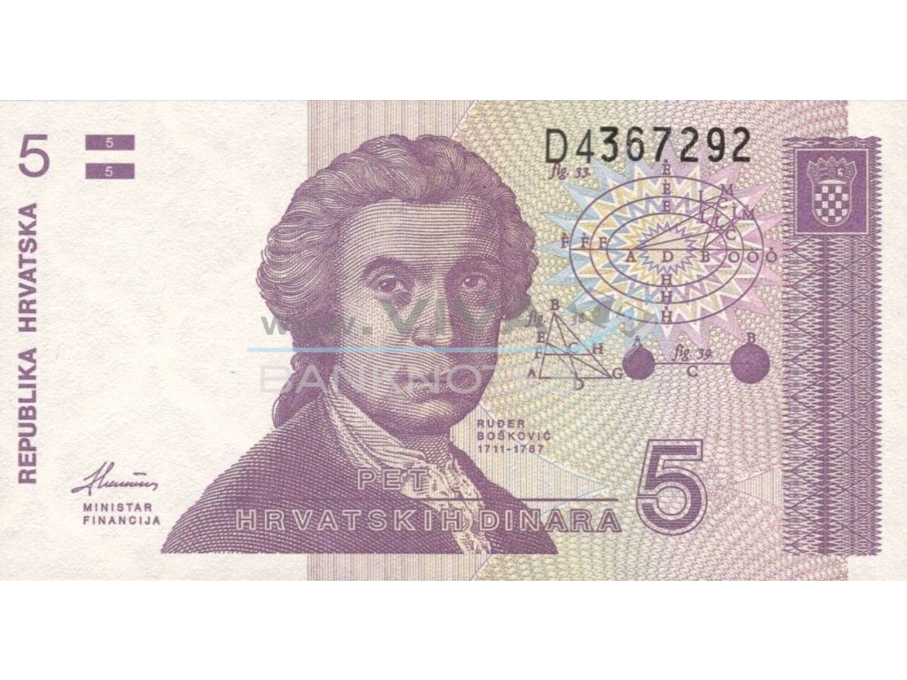 5 Hrvatski Dinar 8.10.1991 UNC. Pale purple on multicolor underprint. Ruder Boskovic at center, geometric calculations at upper right. 4mm serial number. Back: Vertical back with Zagreb cathedral and artistic rendition of city buildings behind. watermark: Lozenges. Printer: Swedish. UV: fibers fluoresce yellow. 105x55mm