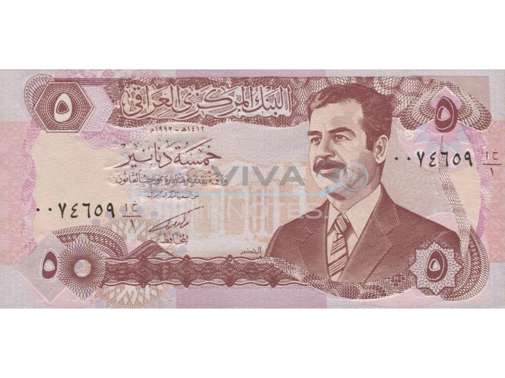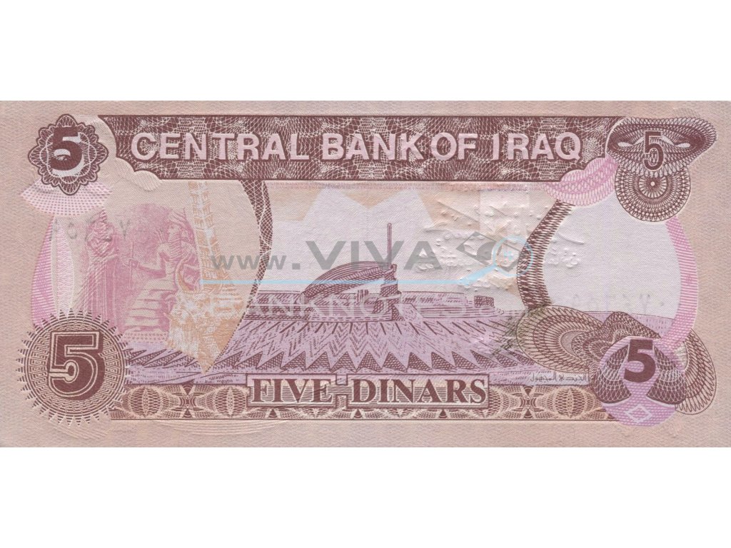 5 Dinars 1992 UNC. Dull red-brown on pale orange, lilac and multicolor underprint. Color shade varieties. Temple at center. Saddam Hussein at right. Back: Hammurabi in conversation with the sun god Shamash at left. Tomb of the unknown soldier in center. Issued by Central Bank of Iraq. Signature Tariq al-Tukmachi. Printer: China.