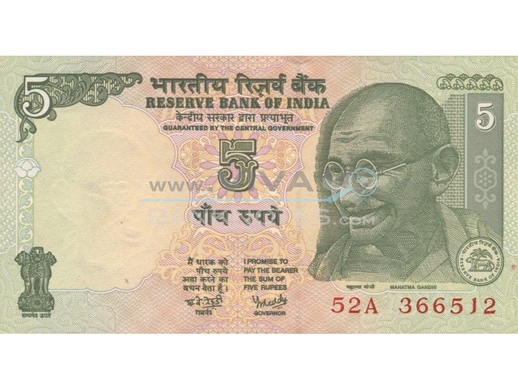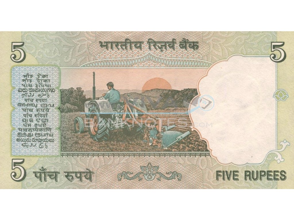 5 Rupees ND(2002)-2008 UNC. Green-orange on multicolor underprint. Mahatma Gandhi at right, Reserve Bank seal at lower right. Back: Farmer plowing with tractor at center. Watermark: Mahatma. Without plate letter. Signature Reddy.