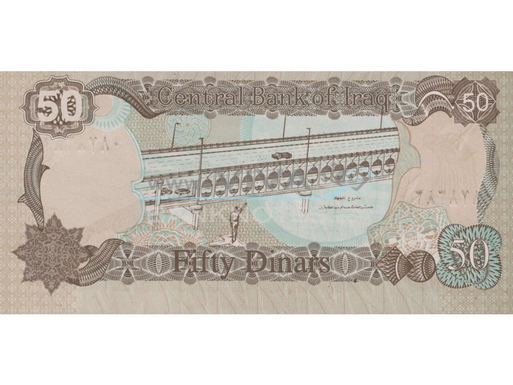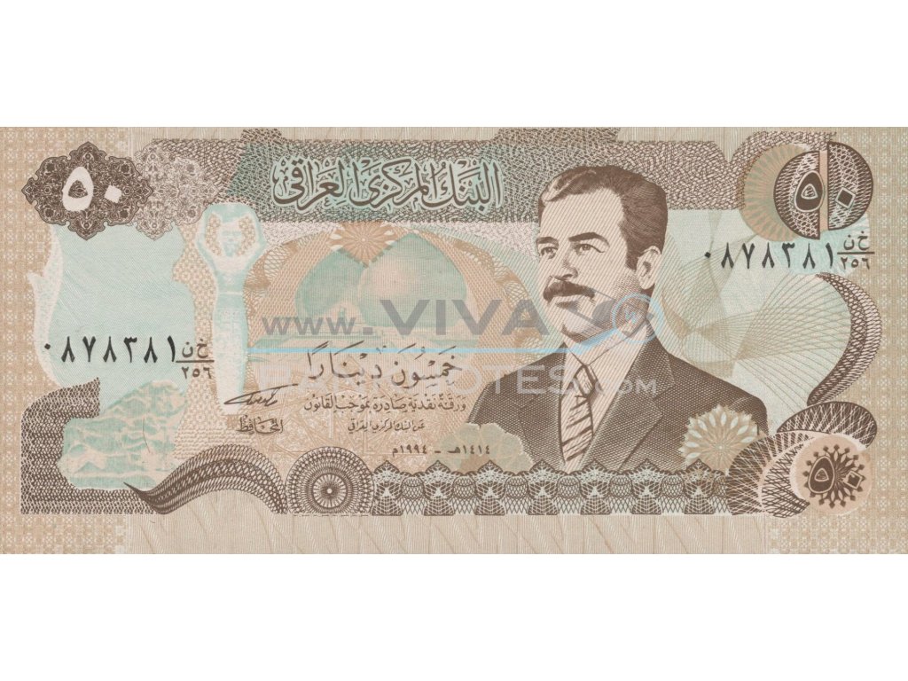 50 Dinars 1994 UNC. Brown and pale green on multicolor underprint. Ancient statuette, monument at left center. Suddam Hussein at right. Back: Masru al-Jihad - Jisr al-Qaid Saddam dhu al-tabiqayn ("Al-Jihad Project" - bridge of the Leader Saddam with double deck) at center. Issued by Central Bank of Iraq. Signature: Tariq al-Tukmachi. 175 x 80mm