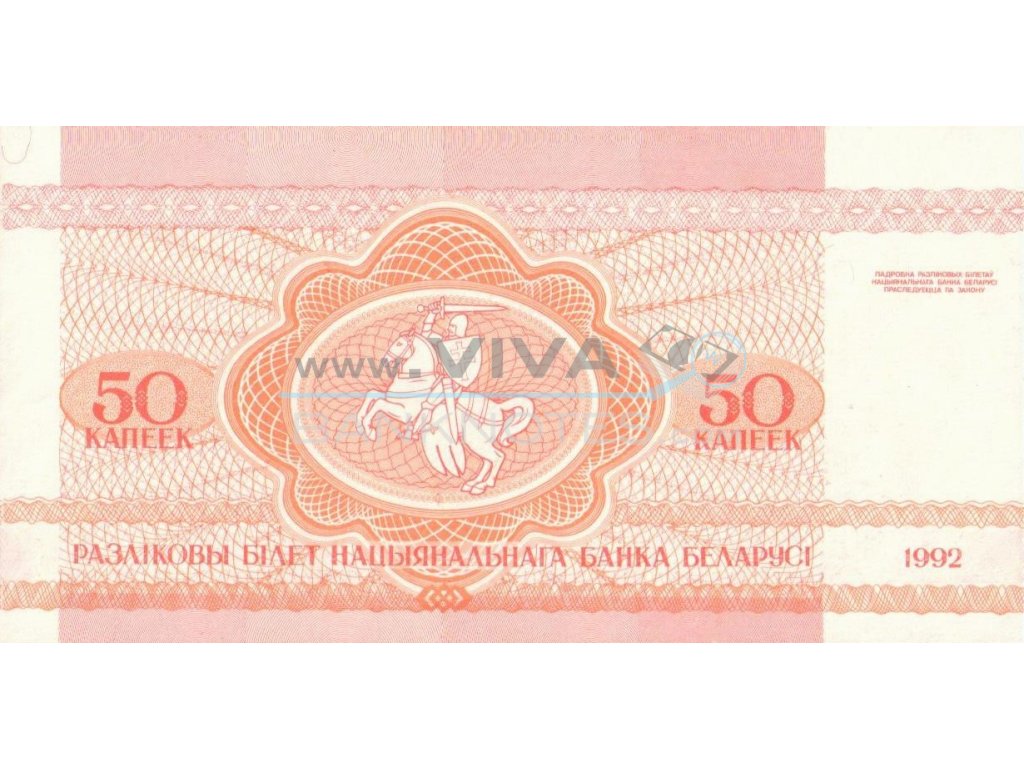 50 Kapeek 1992 UNC. Red and brown-orange on pink underprint. "Pagonya" warrior on horseback at center. Back: Squirrel at center right. Watermark: Interlocked Ss. 105x53mm.