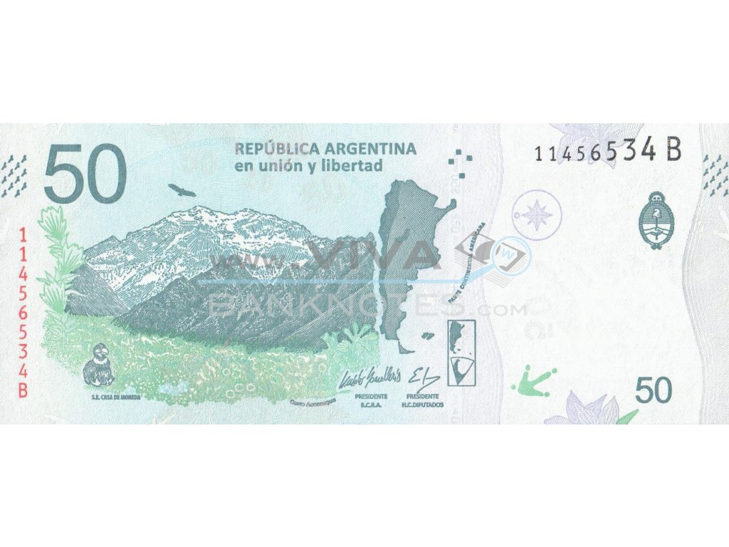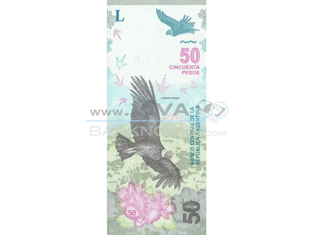 50 Pesos 2018 P363b Series B UNC. Blue, gray and red on multicolor. Andean Condor and ornamental flovers with scenic mountain background. Back: Mount Aconncagua and maps. Signatures Luis Andrés Caputo & Monzó.Issued by Banco Central de la República Argentina. Printer: Sociedad del Estado (S.E.) Casa de Moneda, Buenos Aires. 155x65mm