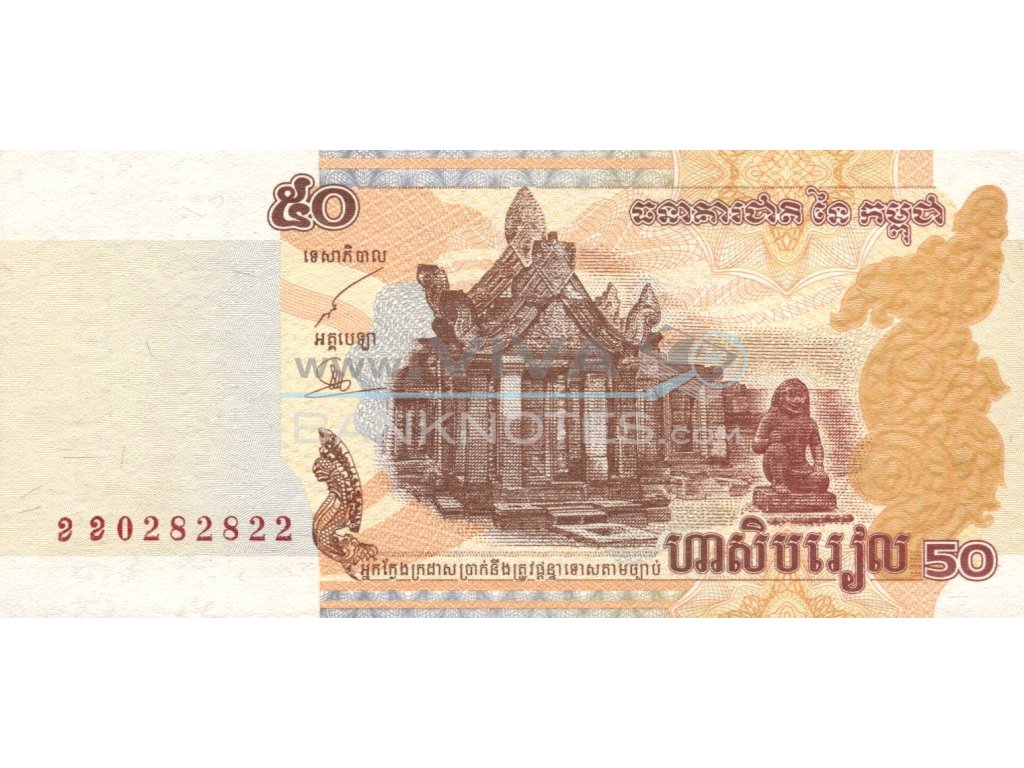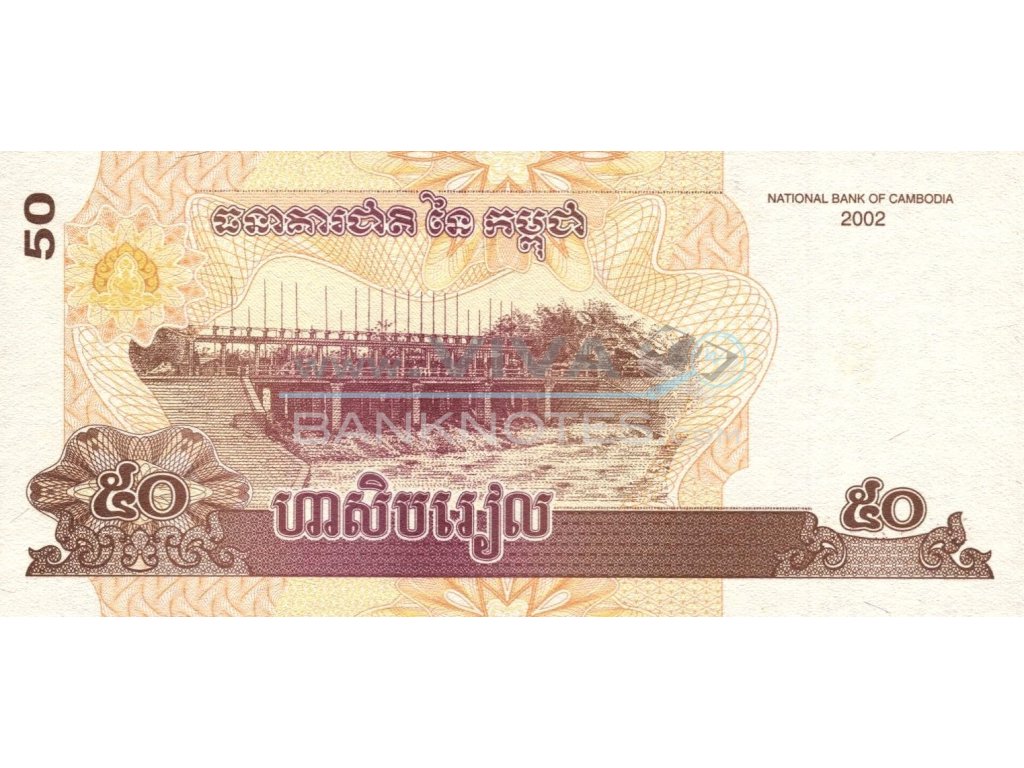 50 Riels 2002 UNC. Dark brown and tan on multicolor underprint. Preah Vihear teple at center, naga heads sculpture at lower left center. Signature Chea Chanto, Tieng Seng. Back: Dam at center. Watermark: Bayon sculpture in Angkor Wat. Issued by National Bank of Cambodia. 130x60mm