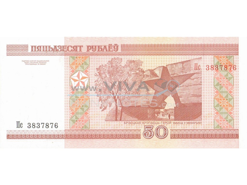 50 Rublei 2000 UNC. Red-brown on multicolor underprint. Brest's tower, Holmsky Gate at left, tapestry at center right. Back: Star shaped war memorial gate way at center right. UV: fluoresce redbnhgmhdsehjugjdklg blue security thread yellow; back: upper serial # red, "50" yellow inwatermark area. 150x69mm.