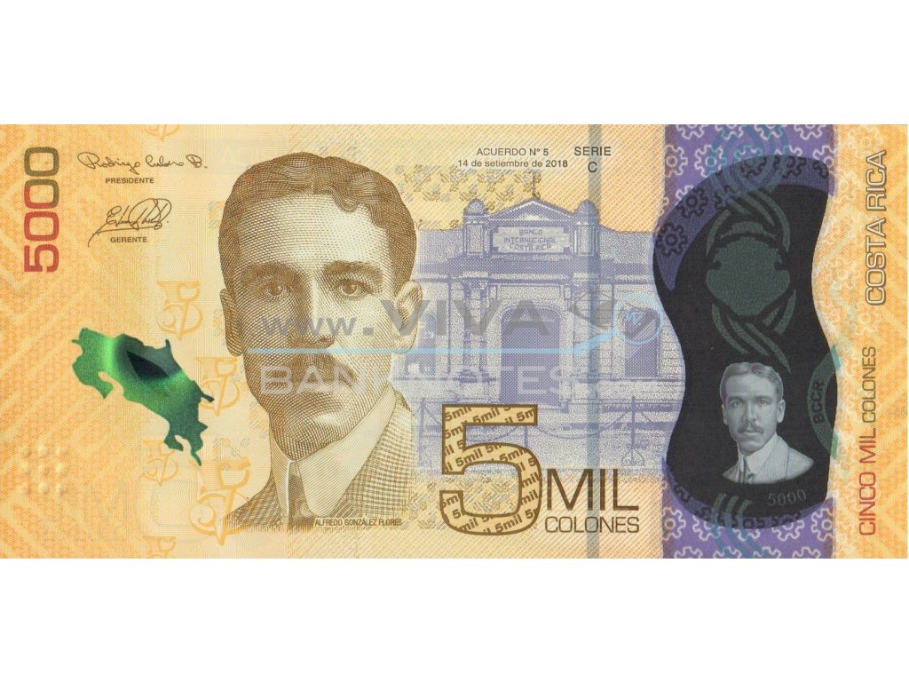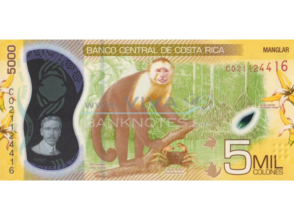 5.000 Colones 14.9.2018 P-W282 Series C UNC. Alfredo González Flores at left, Banco Internacional de Costa Rica building (San José).. Back: Mangrove swamp, flowers, crab, monkey. Material Polymer. Issued by Banco Central de Costa Rica.